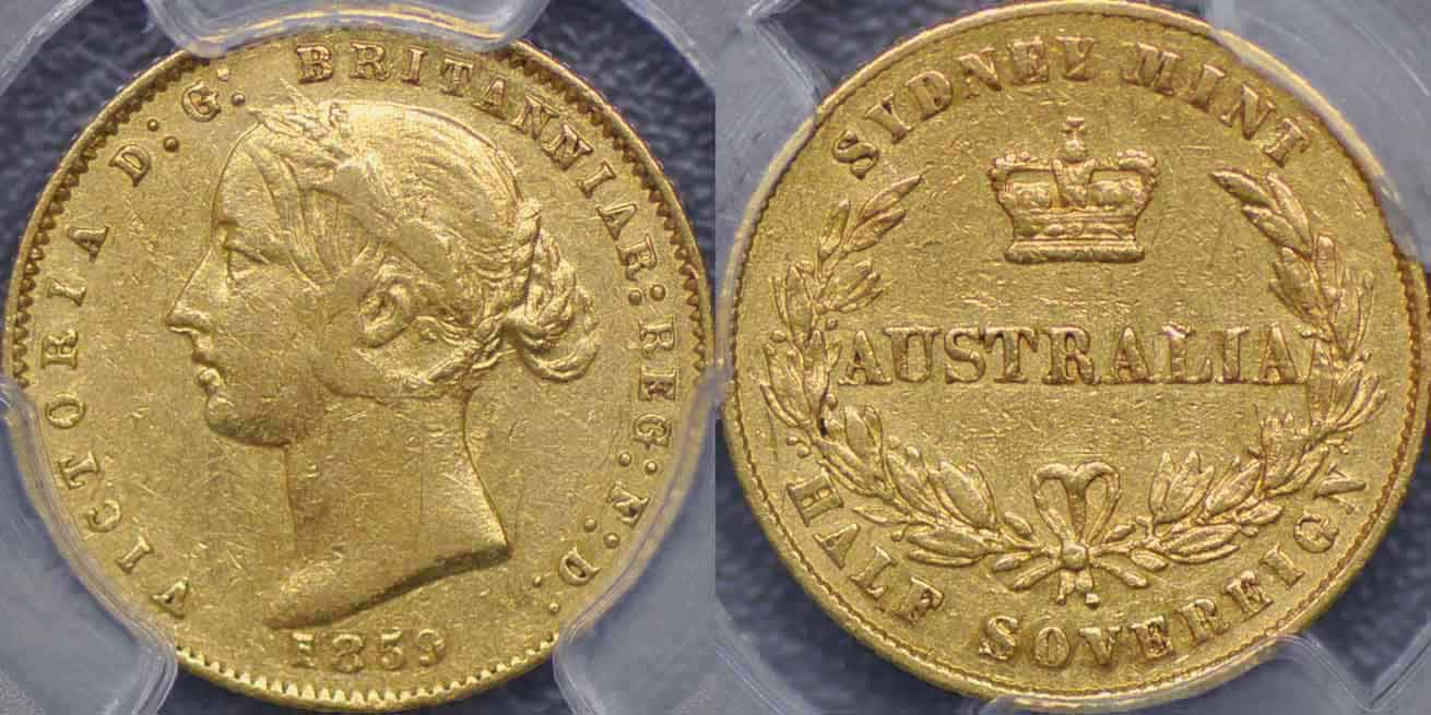 Australia, 1859 Sydney Mint Half Sovereign - Grades PCGS AU50.