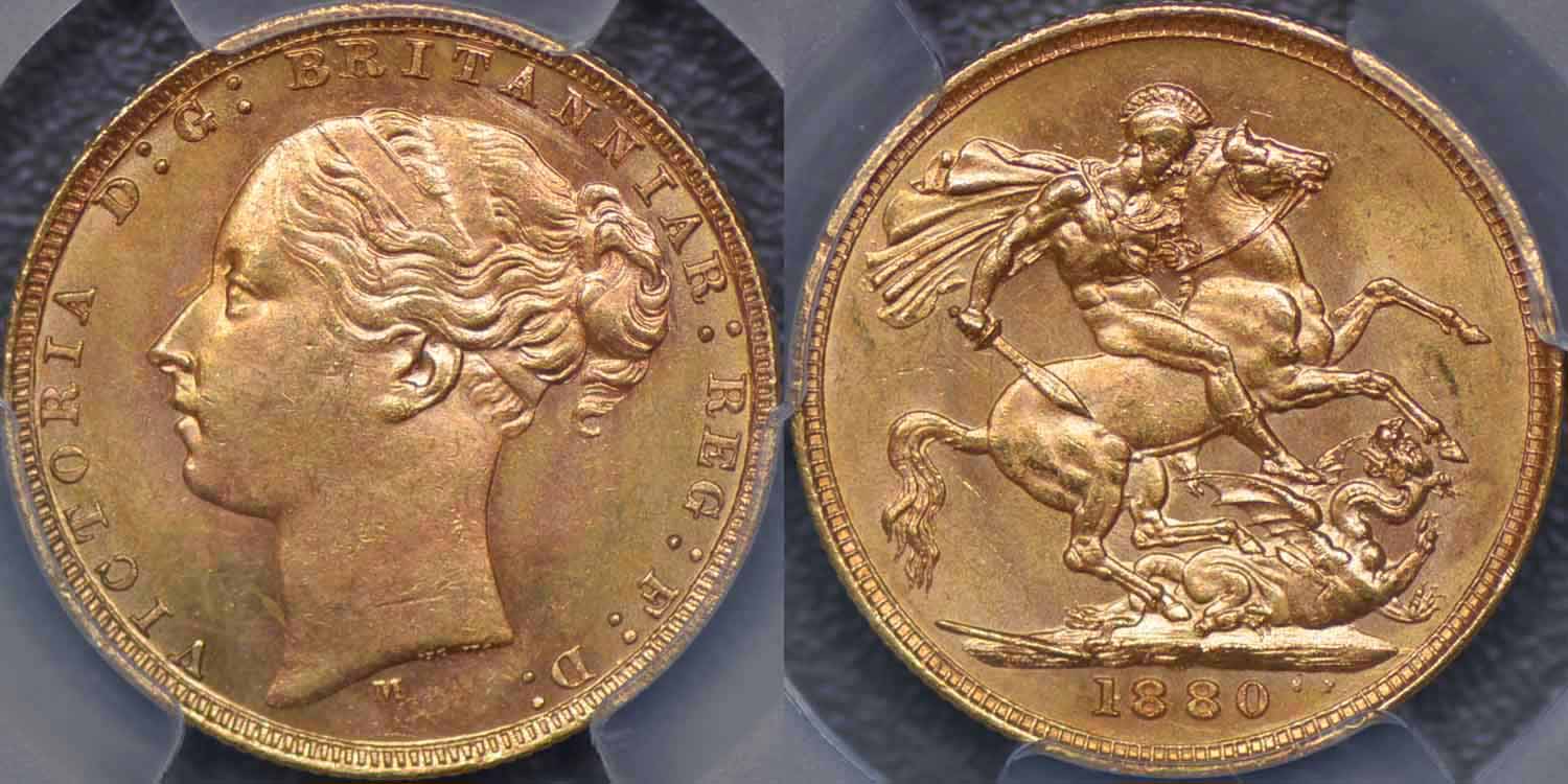 Australia, 1880 Melbourne St George Reverse Sovereign - Grades PCGS MS62.