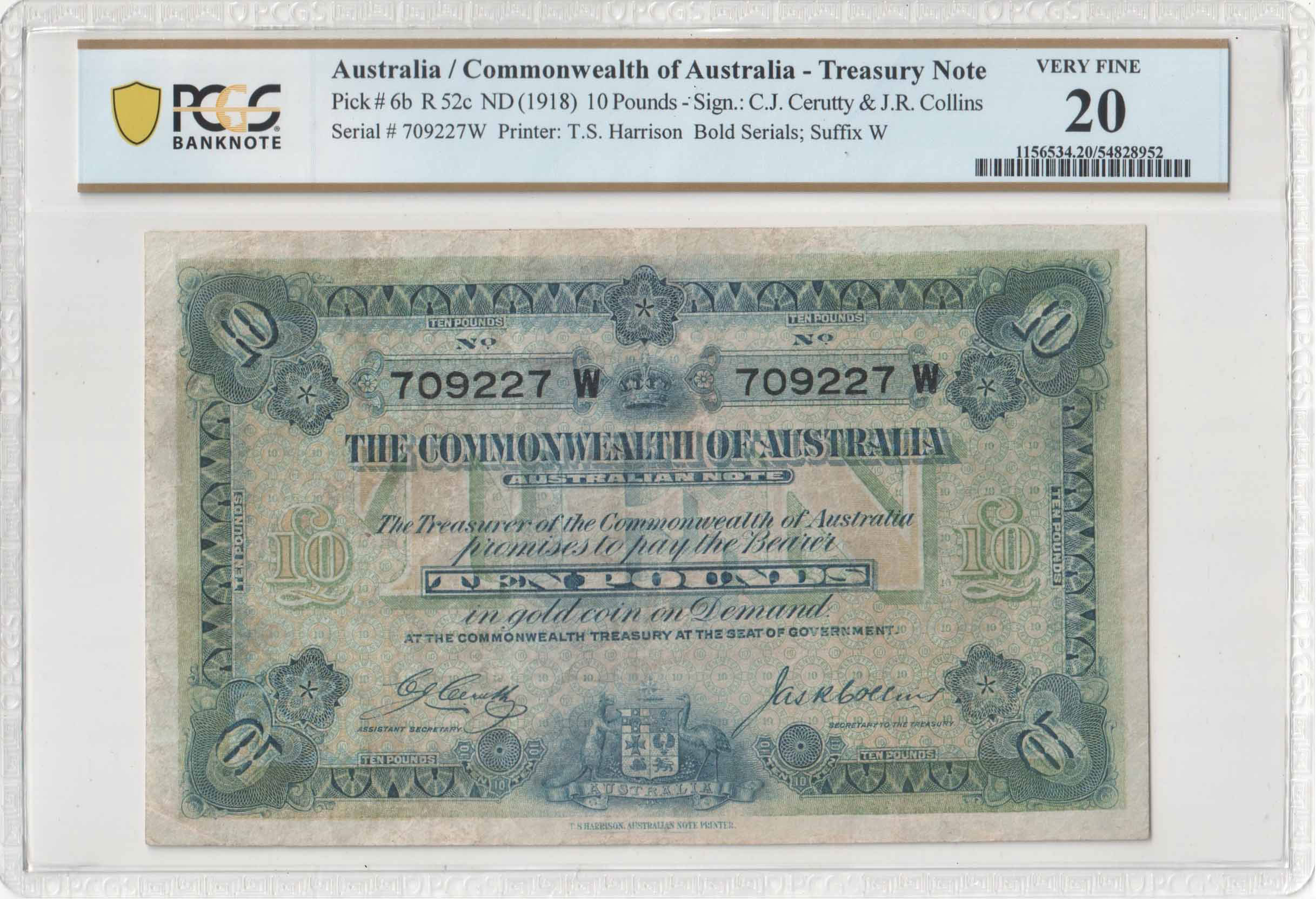 Australia, 1918 Cerutty/Collins Ten Pound - Grades PCGS VF20.