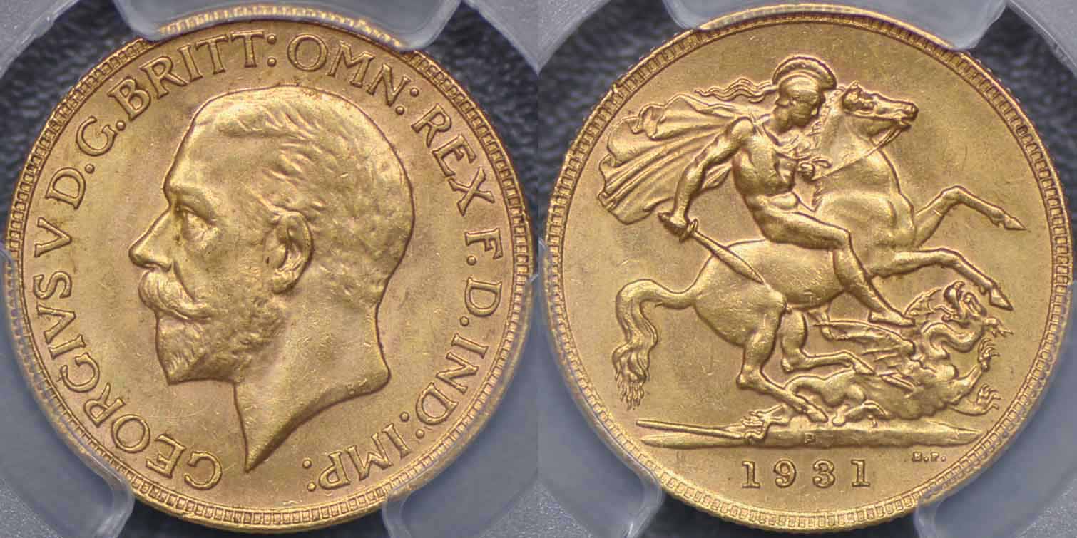 The 1931 Perth sovereign is the final date in Australia’s gold sovereign series. As sovereign production declined in the dying days of the gold standard, so too did sovereign mintages. In fact, the 1931P sovereign has a mintage of just 1,173,567 pieces, which is lower than the mintage figures of several rarer dates, like the 1904 and 1911 Perth. Unlike those dates, though, most 1931P sovereigns were stored as reserves or exported as bullion, and very few, if any, saw circulation. (As a matter of fact, there were no 1931P sovereigns in the Reserve Bank of Australia sovereign auction, so possibly all of them left our shores.) Today, the 1931P sovereign is a common coin in high grade, with hundreds of coins graded by PCGS, and 87 pieces in MS64 or finer (11/20). Multiple coins have been awarded plus grades for superior eye appeal, and two coins have graded MS66+.